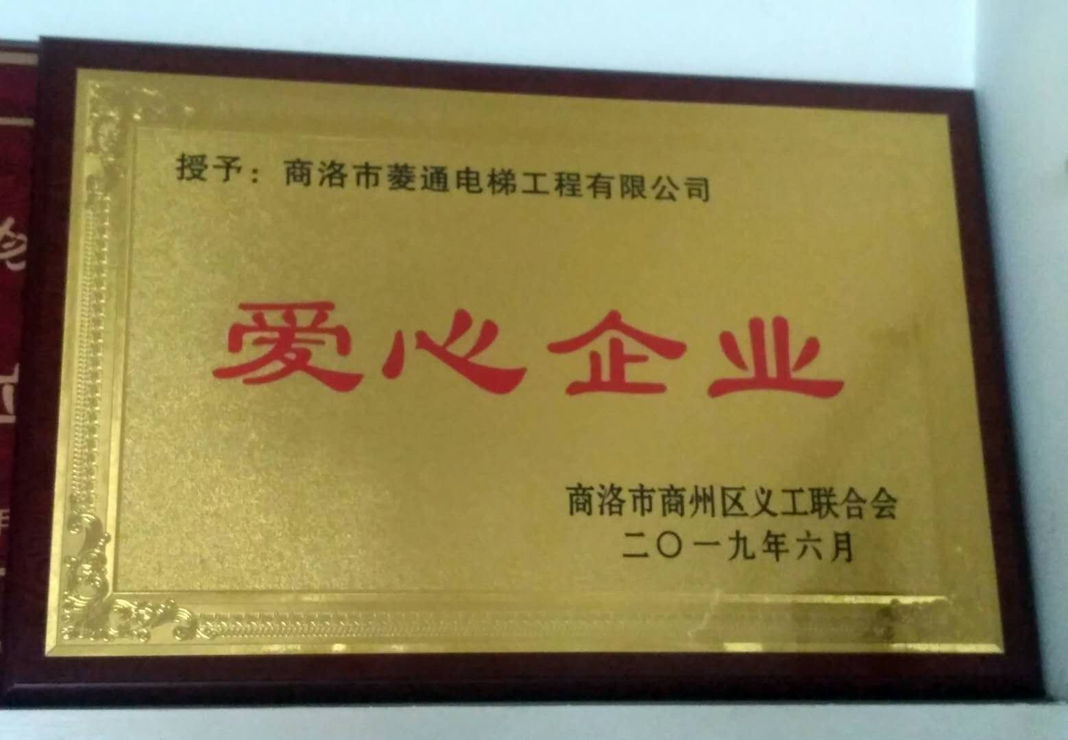 商洛市商州區(qū)義工聯(lián)合會(huì)授予:商洛市菱通電梯工程有限公司愛心企業(yè)獎(jiǎng)牌一個(gè)